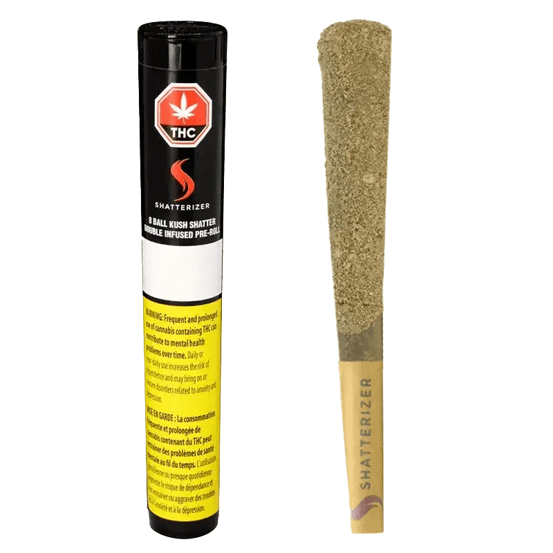We're thrilled to roll out new innovation to our shatterizing family: the 8 Ball Kush Shatter Double Infused Pre-Roll. Made with love in Ontario and with 8 Ball Kush flower, infused with 8 Ball Kush Shatter, our Shatterizer Pre-Roll is double the 8 Ball Kush and then double infused and double rolled.